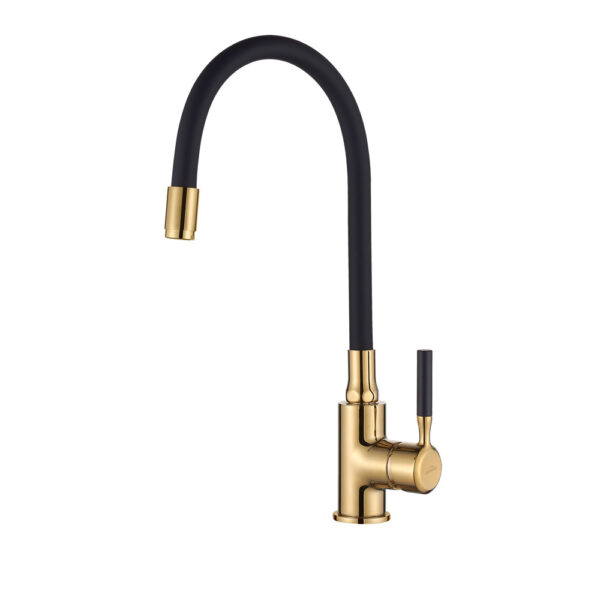 Bateria de bucătărie Invena Glamour este o combinație de două culori care au fost foarte la modă în ultima vreme – negru și auriu. Bateria în sine va fi un decor extraordinar în bucătărie. Are o gură de scurgere flexibilă cu memorie de formă, ceea ce va facilita spălarea vaselor de diferite dimensiuni. O parte a mânerului mixerului este acoperită cu silicon negru în culoarea gurii de scurgere, astfel încât culoarea aurului roz nu copleșește întregul, ci creează un ansamblu subtil.