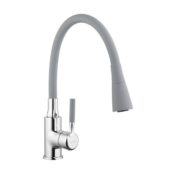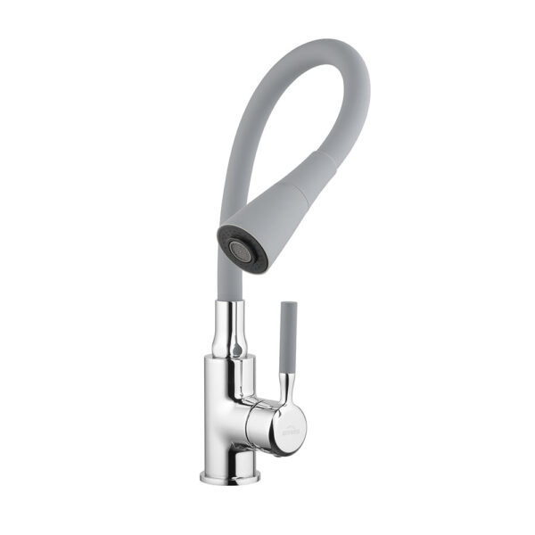 Bateria de bucătărie Invena HULA are o gură de scurgere flexibilă, foarte practică, cu memorie de formă – astfel încât să o puteți ajusta oricând în funcție de dumneavoastră. Combinația dintre culoarea gri și forma unică se potrivește perfect în orice bucătărie, unde va atrage, fără îndoială, privirile la prima vedere. Suprafața netedă și durabilă asigură o curățare ușoară.