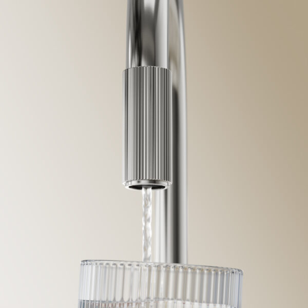 Designul contemporan al colectiei cuprinde proportii bine echilibrate si ofera o functionare intuitiva. Detaliile definite curat marcheaza cele doua fluxuri de apa separate – apa obisnuita prin mixer si apa filtrata din varful scurgerii. Aceste elemente distinctive sunt compensate de linia mixerului minimalist cu curbe subtile.