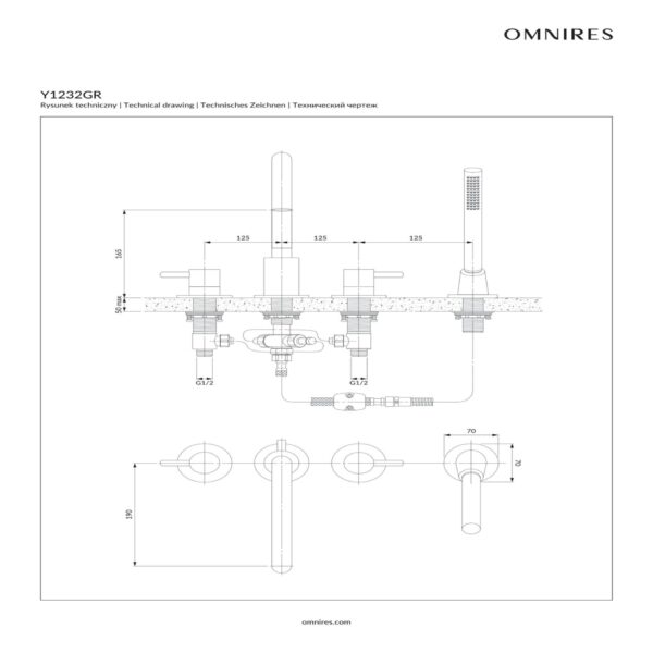 Baterie cada/dus Omnires Y 4 orificii finisaj grafit periat cu set de dus