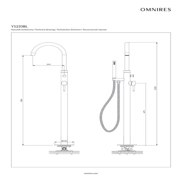 Baterie cada freestanding cu montaj pe pardoseala Omnires Y negru