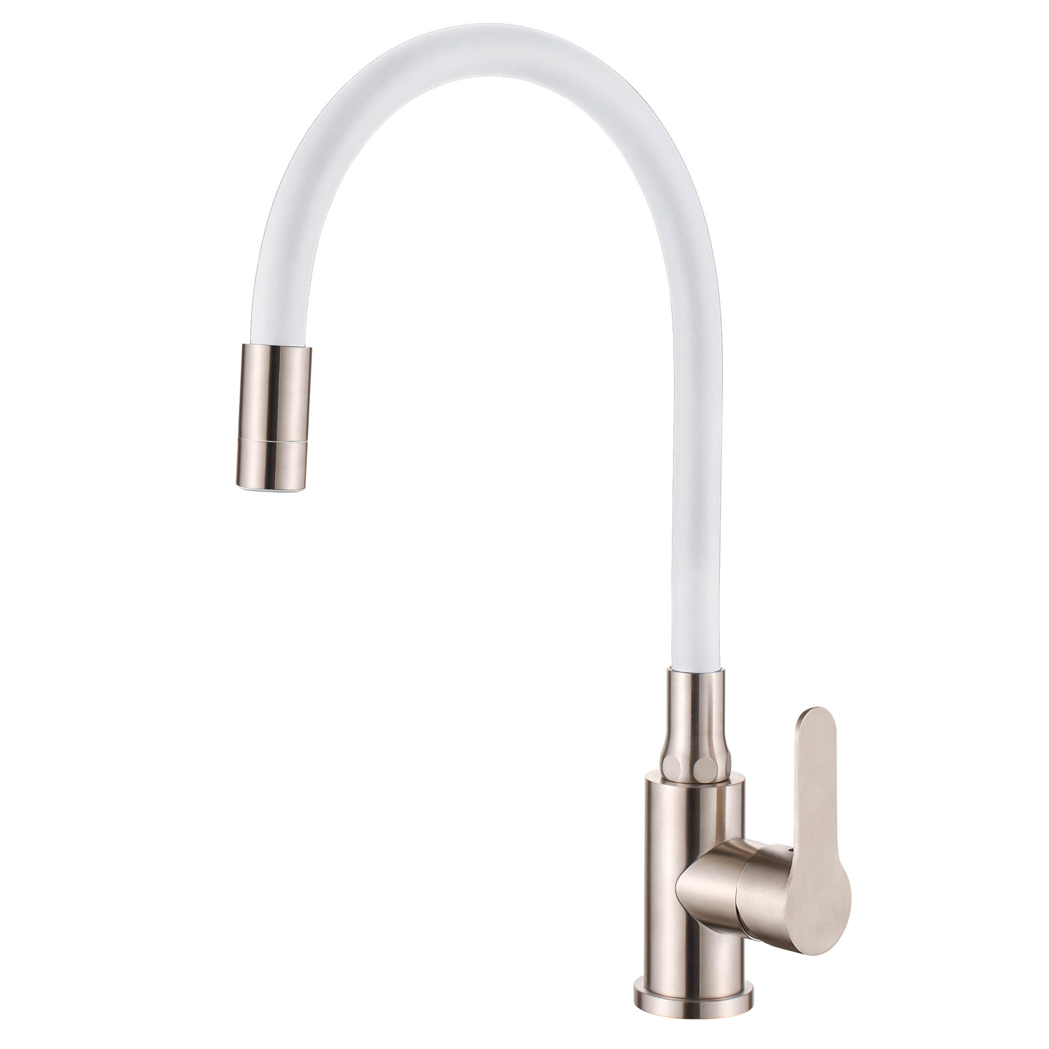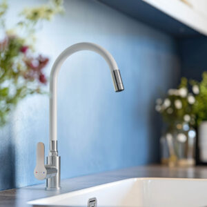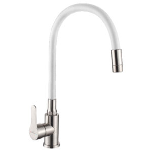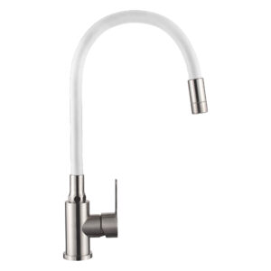 Baterie de bucătărie cu pipă flexibilă și 2 tipuri de jet Invena KSANTI albă și argintiu