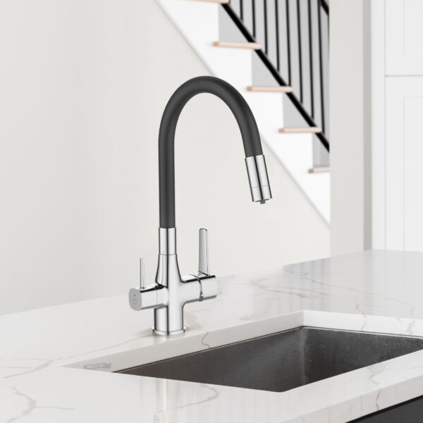Bateria de bucătărie Invena GLAMOUR este un accesoriu ideal pentru bucătăriile moderne. Combinția de culori este ideală pentru orice tip de design interior. Bateria nu are doar rol estetic, aceasta este si foarte practică având o funcție de filtrare a apei, o gură de scurgere pivotantă si flexibilă cu memorie de formă ce face transformă spălatul vaselor sau al legumelor într-o activitate foarte plăcută și ușoară. Pentru că știm cât de important este mediul înconjurător robinetul vine cu un aerator ce are rolul de a reduce consumul de apă, oprind picurarea robinetului odată ce acesta a fost oprit.