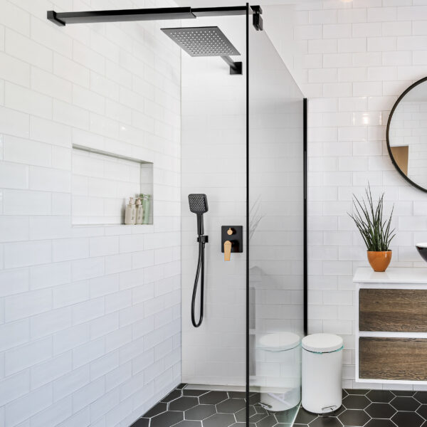 Bateria încastrată din seria Invena Midnight cu comutator pentru tipurile de pulverizare permite utilizarea atât a unui duș cu efect de ploaie, cât și a unui set de duș. Designul modern înseamnă că bateria se va potrivi perfect în multe tipuri de design.