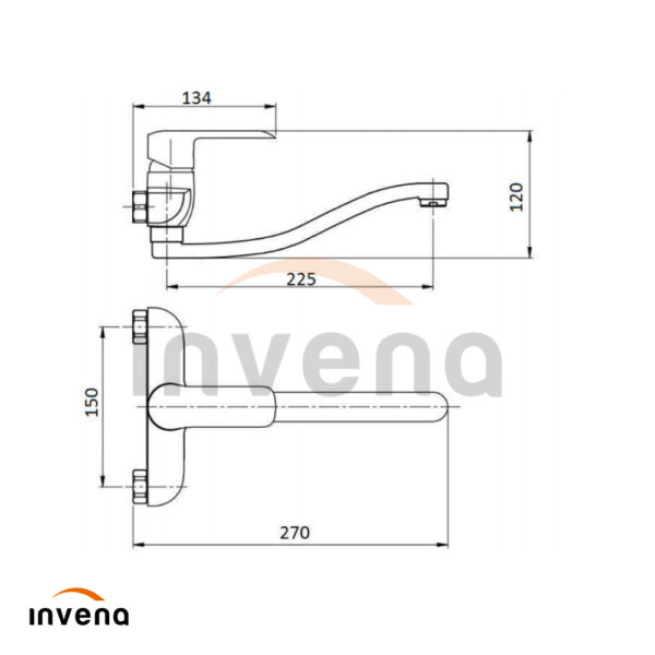 Bateria de chiuvetă cu montaj pe suprafața peretelui din seria Invena Siros completează designul interior modern. Robinetul este ideal pentru bucătăriile mici cu instalații sanitare tradiționale, pentru care alegerea robinetelor de bucătărie interesante este limitată. Cu acest produs câștigăm funcționalitate și un design unic. Gura de scurgere lungă de 21,5 cm oferă confort de utilizare.