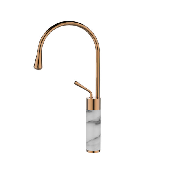 Bateria înaltă de lavoar Invena Stone a fost creat pentru clienții care doreau să-și amenajeze baia într-un stil vintage, dar cu o notă modernă. Este o combinație de cupru și marmură. Gura de scurgere din cupru este juxtapusă cu corpul de marmură albă și gri al mixerului. Mixerul ceramic durabil și materialele de înaltă calitate garantează că bateria va fi utilizată timp de mulți ani. Bateria ajută la crearea unei zone de lavoar funcționale împreună cu chiuveta de blat.