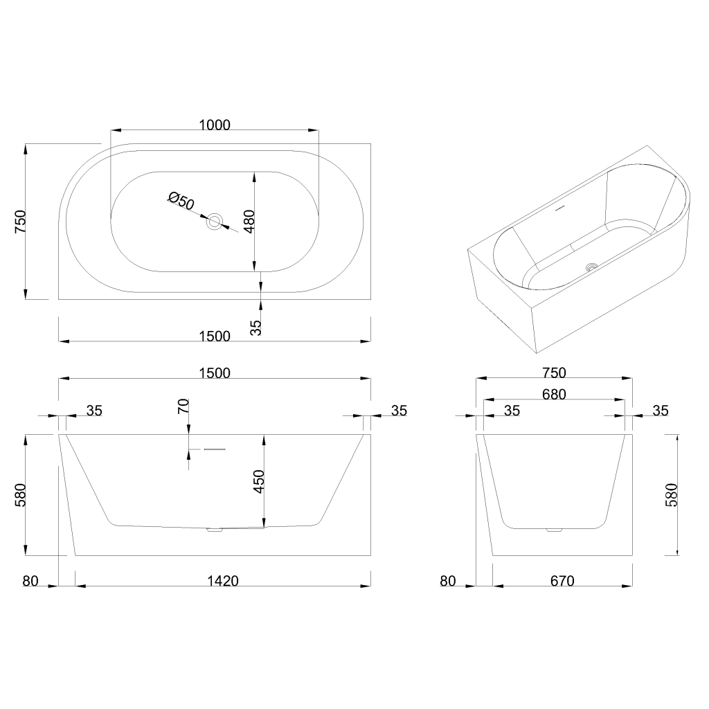 Cada freestanding Invena Astri, 150 cm, pe partea stanga,cu sifon, dop si sistem preaplin