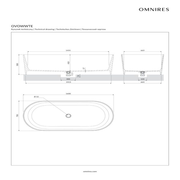 Silueta expresiva a cazii freestanding Omnires Ovo are proportii impecabile. Peretii exteriori aproape verticali se termina intr-o margine plana care evidentiaza designul indraznet al cazii. Profilul interior al cazii sustine confortabil spatele, in timp ce fundul larg ofera un spatiu amplu. Setarea incastrata a cazii este ideala pentru imbaierea copiilor si face intrarea si iesirea din cada mult mai usoara. Dispune de solutii functionale, cum ar fi o capcana de baie de deseuri perfect potrivita si amplasata central, ceea ce face ca cada sa fie ideala pentru momentele comune de relaxare.