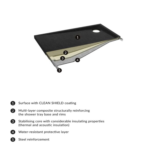 Cadita de dus Omnires Stone este realizata din material compozit multistrat pentru a asigura o durabilitate si o rezistenta extraordinare. Suprafata mata a caditei de dus cu efect de textura de piatra naturala este acoperita cu ajutorul tehnologiei anti-bacteriene CleanShield. Acoperirea imbunatateste proprietatile antimicrobiene ale caditei si faciliteaza curatarea. Stratul stabilizator intareste cadita de dus, asigurand in acelasi timp izolarea termica si acustica. Stratul de etansare protejeaza impotriva umezelii si formarii mucegaiului.
