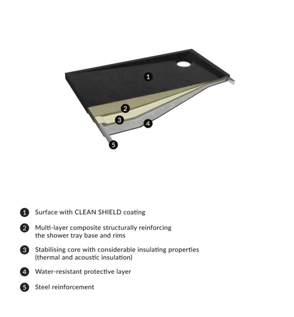 Cadita de dus Omnires Stone este realizata din material compozit multistrat pentru a asigura o durabilitate si o rezistenta extraordinare. Suprafata mata a caditei de dus cu efect de textura de piatra naturala este acoperita cu ajutorul tehnologiei anti-bacteriene CleanShield. Acoperirea imbunatateste proprietatile antimicrobiene ale caditei si faciliteaza curatarea. Stratul stabilizator intareste cadita de dus, asigurand in acelasi timp izolarea termica si acustica. Stratul de etansare protejeaza impotriva umezelii si formarii mucegaiului.