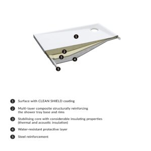 Cadita de dus acrilica Omnires Merton este realizata din straturi foarte rezistente de polimeri si componente minerale, amestecate cu compusi PU+ spumati. Aceasta isi mentine proprietatile termice (cadita ramane calda) si acustice (zgomotul generat de picaturile de apa este redus cu 40%) , avand proprietati de izolare. Datorita sistemului sau unic de umplere si stabilizare, precum si a componentelor de armare metalica, cadita pastreaza o forma foarte compacta. Este rezistenta la umiditate si mucegai.