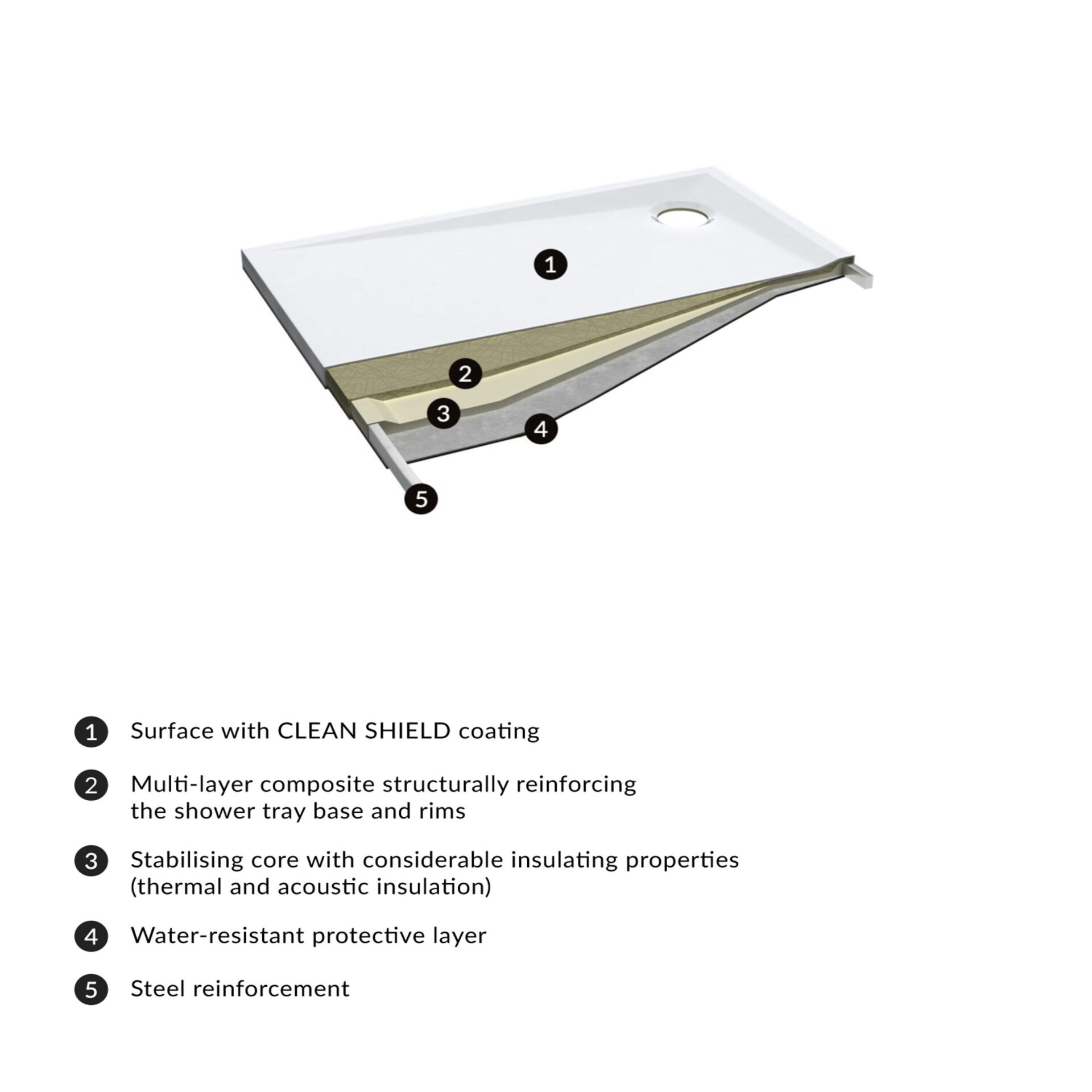 Cadita de dus acrilica Omnires Merton este realizata din straturi foarte rezistente de polimeri si componente minerale, amestecate cu compusi PU+ spumati. Aceasta isi mentine proprietatile termice (cadita ramane calda) si acustice (zgomotul generat de picaturile de apa este redus cu 40%) , avand proprietati de izolare. Datorita sistemului sau unic de umplere si stabilizare, precum si a componentelor de armare metalica, cadita pastreaza o forma foarte compacta. Este rezistenta la umiditate si mucegai.