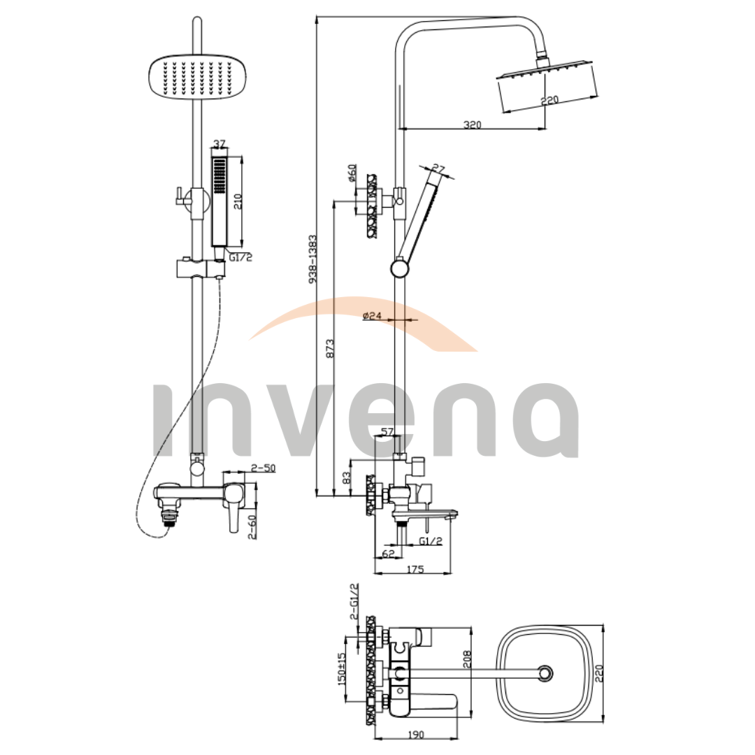 - Coloană de duș reglabilă în înălțime, de la 94 la 138 cm