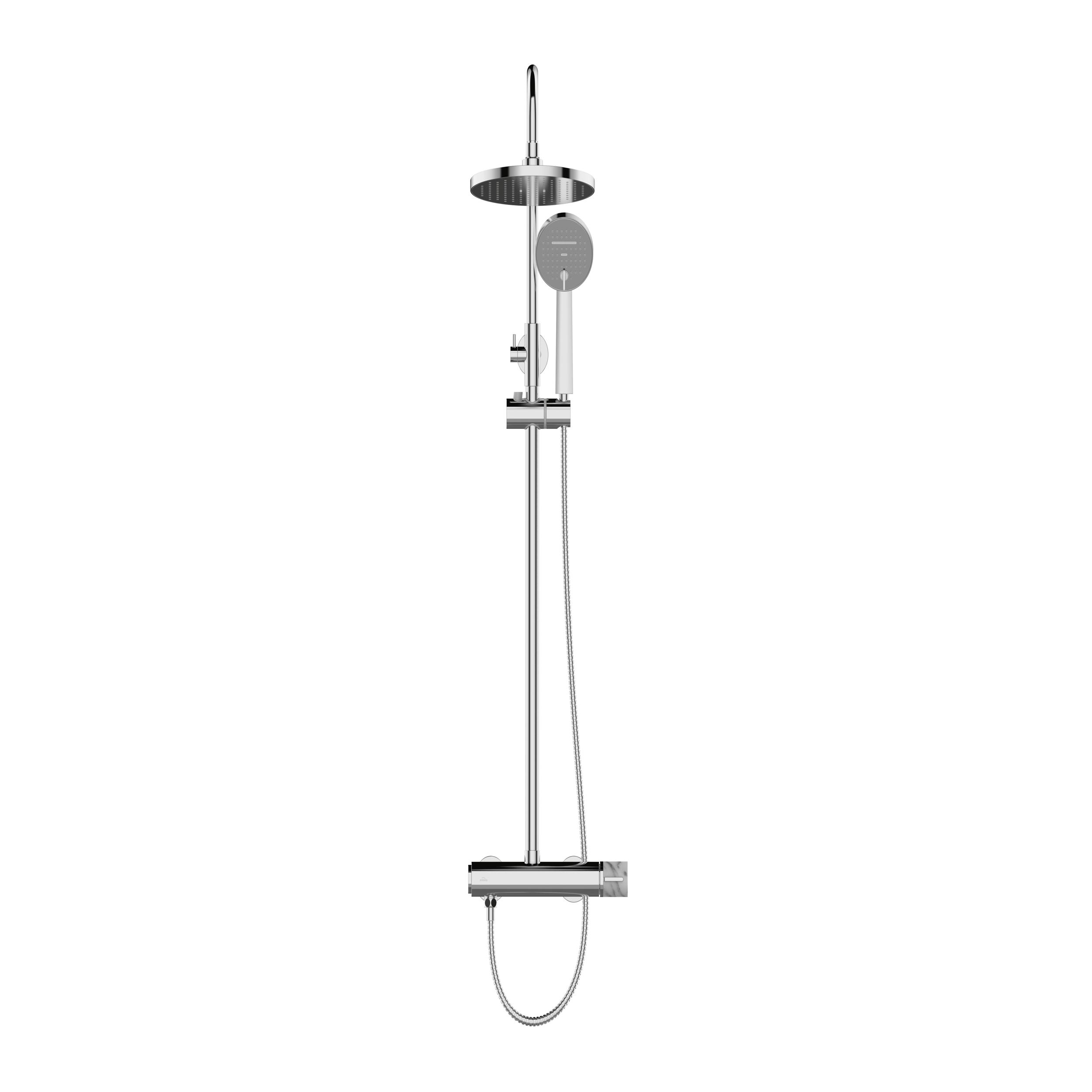 Coloana de duș Invena GABRO PLUS ce vine împreună cu o baterie de duș cu mâner finisat în marmură albă va lumina și va adăuga o notă elegantă oricărei zone de duș. Albul marmurei combinat cu cromul reprezintă o soluție care este atât la modă, cât și atemporală. Cele 2 tipuri de pulverizare disponibile în dușul de mână vor face ca orice duș să fie mai plăcut. Picăturile blânde ale dușului tip ploaie liniștesc simțurile ca o ploaie caldă de vară. Dușul de mână și dușul tip ploaie sunt echipate cu puncte de duș anticalcar, ceea ce face ca întreținerea lor să fie mult mai ușoară. Dușul subțire de deasupra capului reduce picurarea atunci când este oprit, ceea ce îl face o opțiune pentru cei care apreciază soluțiile ecologice. Înălțimea reglabilă a coloanei face posibilă adaptarea acesteia la nevoile și posibilitățile individuale ale încăperii, iar integrarea cu bateria de duș facilitează, de asemenea, menținerea curățeniei întregii coloane.