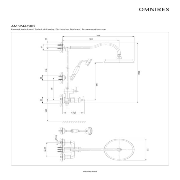 Coloana de dus cu baterie monocomanda si palarie dus rotunda Omnires Armance cupru antichizat