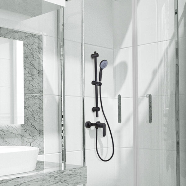 Bateria de duș Invena Siros în negru mat vă permite să creați un interior versatil, dar original. Negrul intens contrastează perfect cu albul plăcilor și al ceramicii, oferind zonei de duș o notă de eleganță
