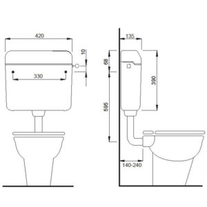 Rezervorul alb este construit pe urmatoarele dimensiuni: 420 mm latime, 390 mm inaltime si 135 mm adancime. Montarea se realizeaza pe perete, iar pachetul de livrare contine piese atasate pentru montarea rezervorului, mecanism, sablon pentru montaj si tub de conexiune.