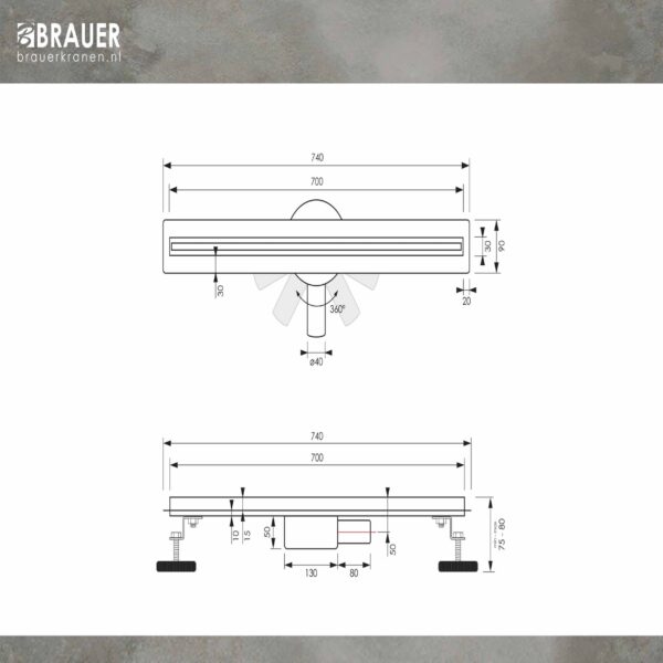 Rigola de scurgere pentru duș Brauer XS cu flanșă de podea este un finisaj elegant, cu sifon rotativ . Acestă rigolă de duș elegantă este un înlocuitor excelent pentru un sifon de duș în stil vechi. Datorită flanșei de podea, scurgerea dușului este simplu și rapid de montat. Placile se conectează perfect la scurgerea dușului, ceea ce asigură un finisaj frumos. Pe lângă un aspect frumos, sifonul de duș este, de asemenea, mult mai ușor de întreținut decât scurgerea de duș de modă veche. Sifonul de duș este disponibil în lungimi de 70 cm , 80 cm și 90 cm . Lățimea grilei este de 3,1 cm . Sifonul de duș este furnizat cu etanșare, filtru de păr și cheie.