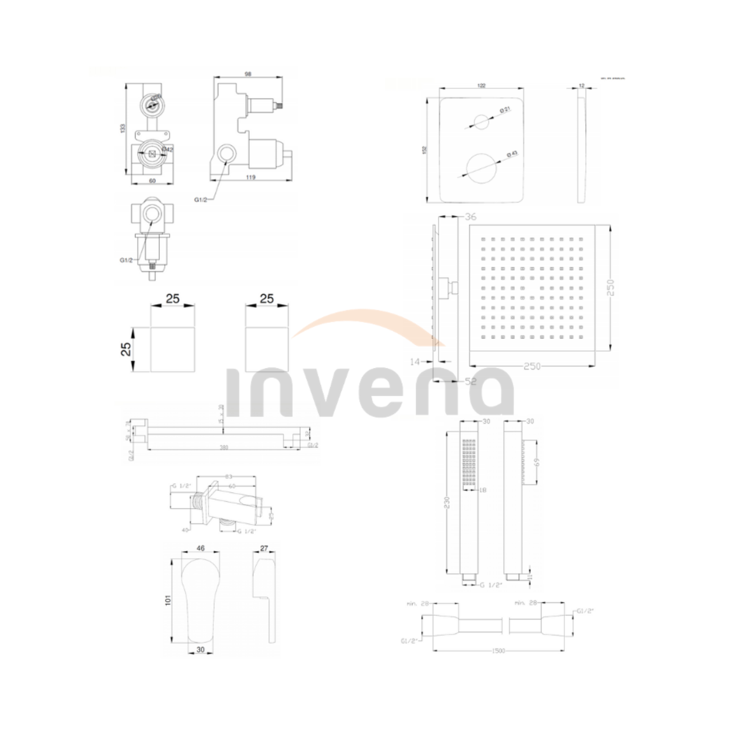 • Duș tip ploaie: pătrat 25 x 25 cm, subțire, abs, anti-calc