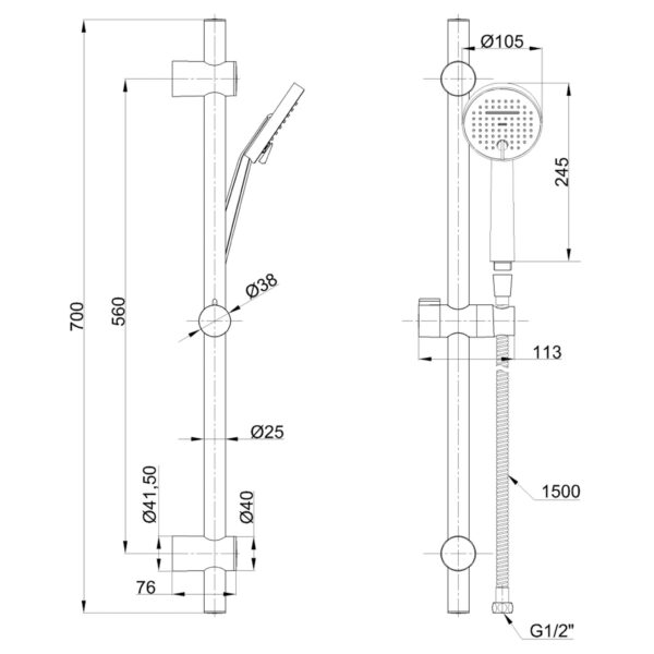 • Dimensiuni duș de mână: 10,5 × 24,5 cm
