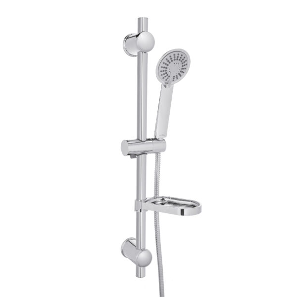 Set de duș cu bară subtilă FRESCO, 3 tipuri de pulverizare posibile. Vine cu un raft convenabil pentru cosmetice. Ansamblul reprezintă o notă de finisare funcțională și estetică plăcută pentru baie.